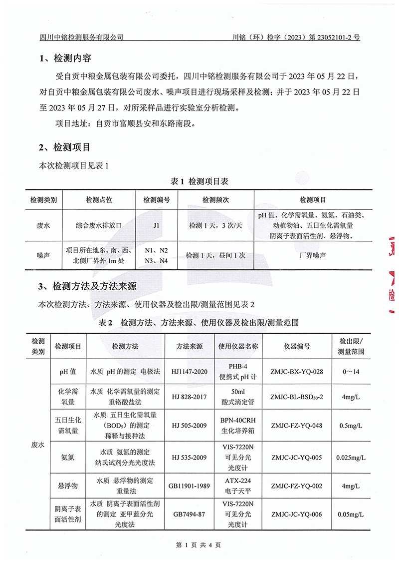 自贡中粮金属包装有限公司废水、噪声监测报告